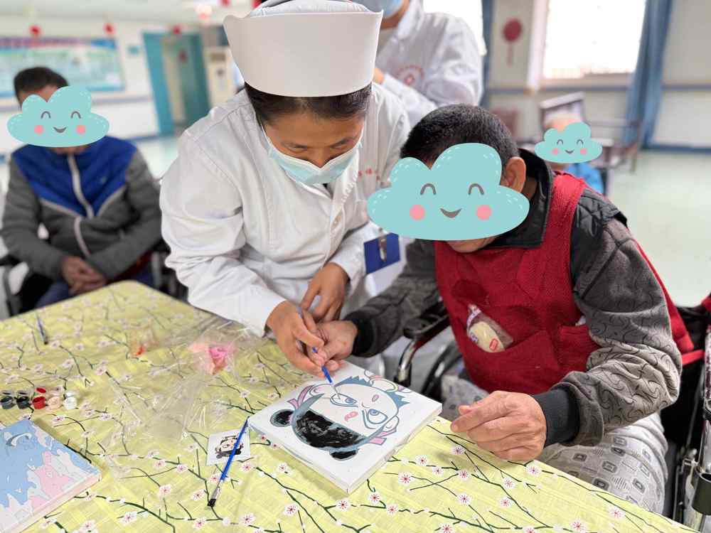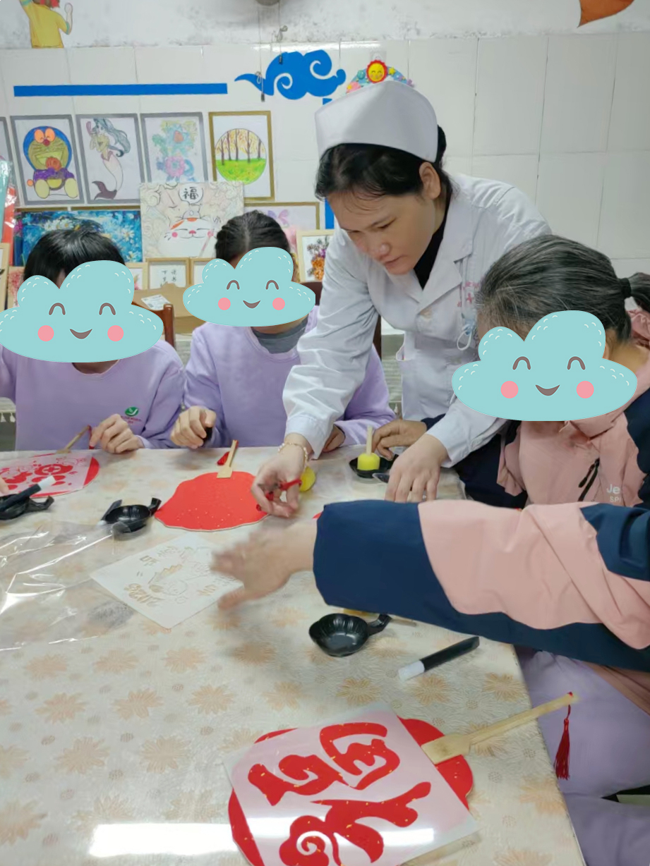 内一科的剪窗花、涂鸦布袋活动和精四科的手工画福字活动创意十足,患者们手持剪刀、彩纸、画笔,在医护人员的指导下剪窗花、绘布袋、画福字。红纸翻飞,一张张寓意吉祥的窗花跃然纸上;彩笔舞动,一个个独一无二的涂鸦袋展现眼前;毛笔挥洒,一幅幅生动别致的福字传递祝福。