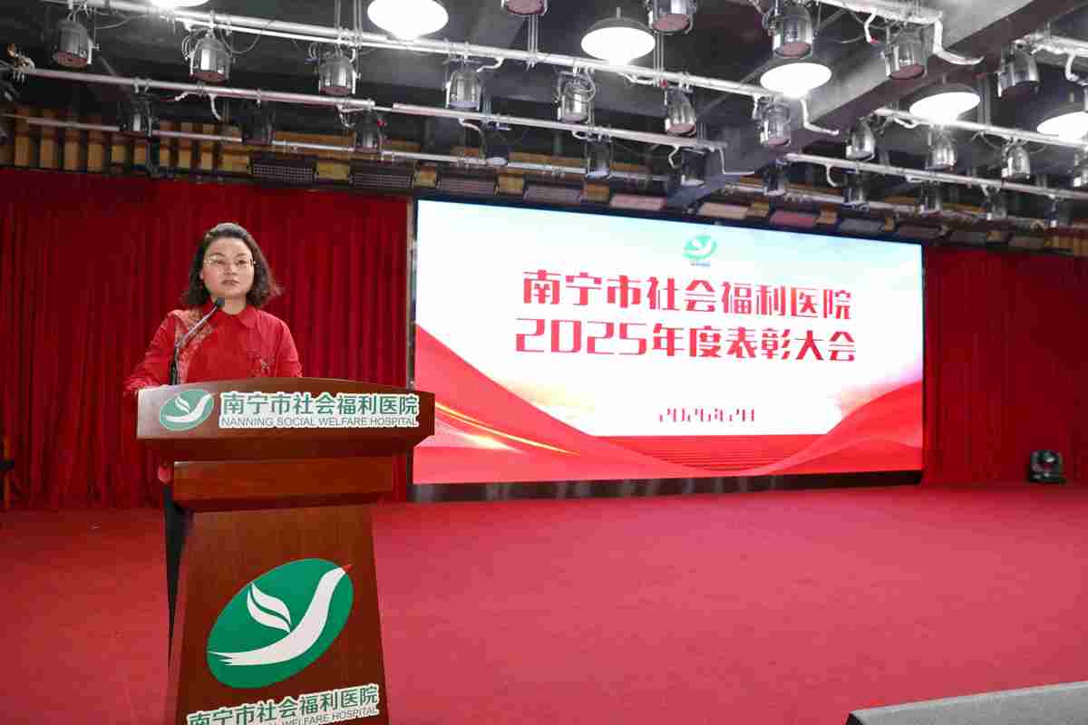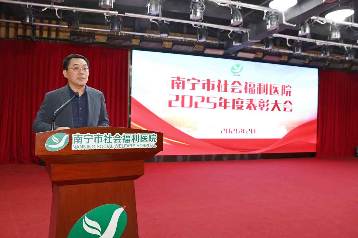 近日,南宁市社会福利医院在住院大楼会议室召开2025年度表彰大会。会议全面总结晋升国家三级精神病专科医院后的开局之年工作成效,科学谋划2026年重点工作任务,并对年度表现优异的集体和个人进行表彰。医院党委书记张国兵、院长张春林、副院长韦旻佺、副院长黄艳及全院干部职工参加大会。会议由副院长黄艳主持。